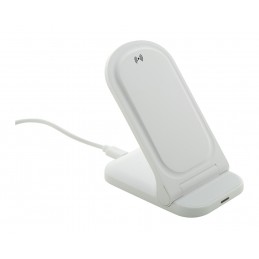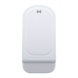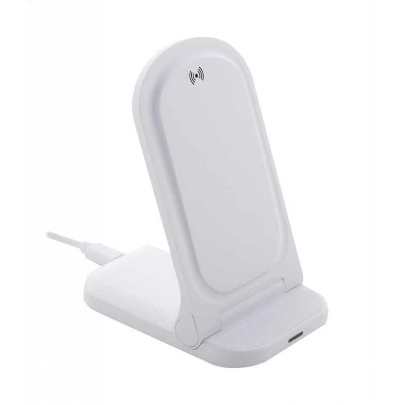 Suport telefon mobil de birou, pliabil, reglabil, din plastic ABS reciclat, cu încărcător rapid fără fir încorporat (15W). Inclusiv cablu de încărcare USB.