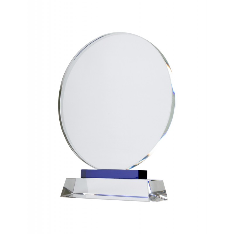 Trofeu rotund din sticlă, în cutie neagră de cadou.